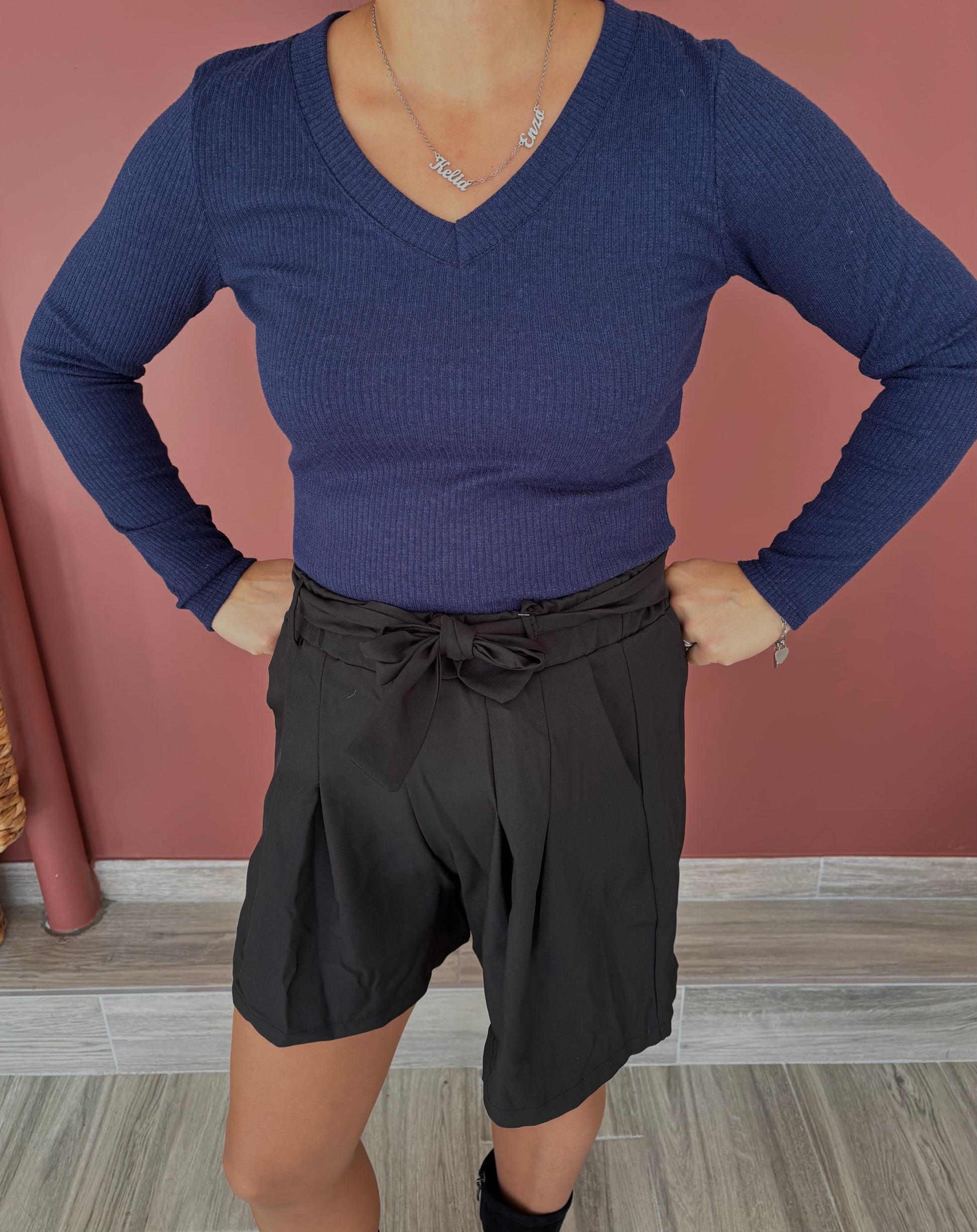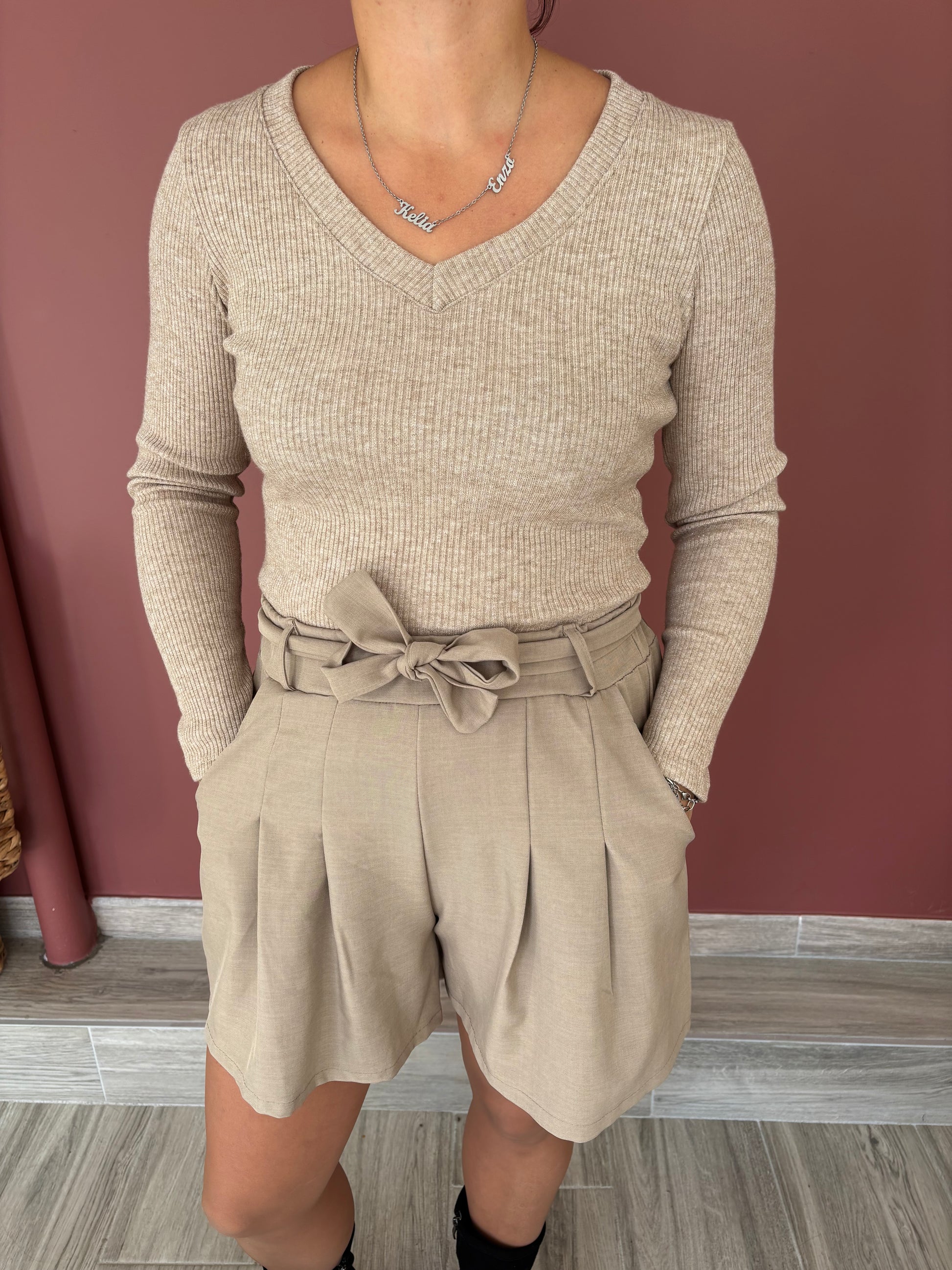Pull col V matière brillante manches longues