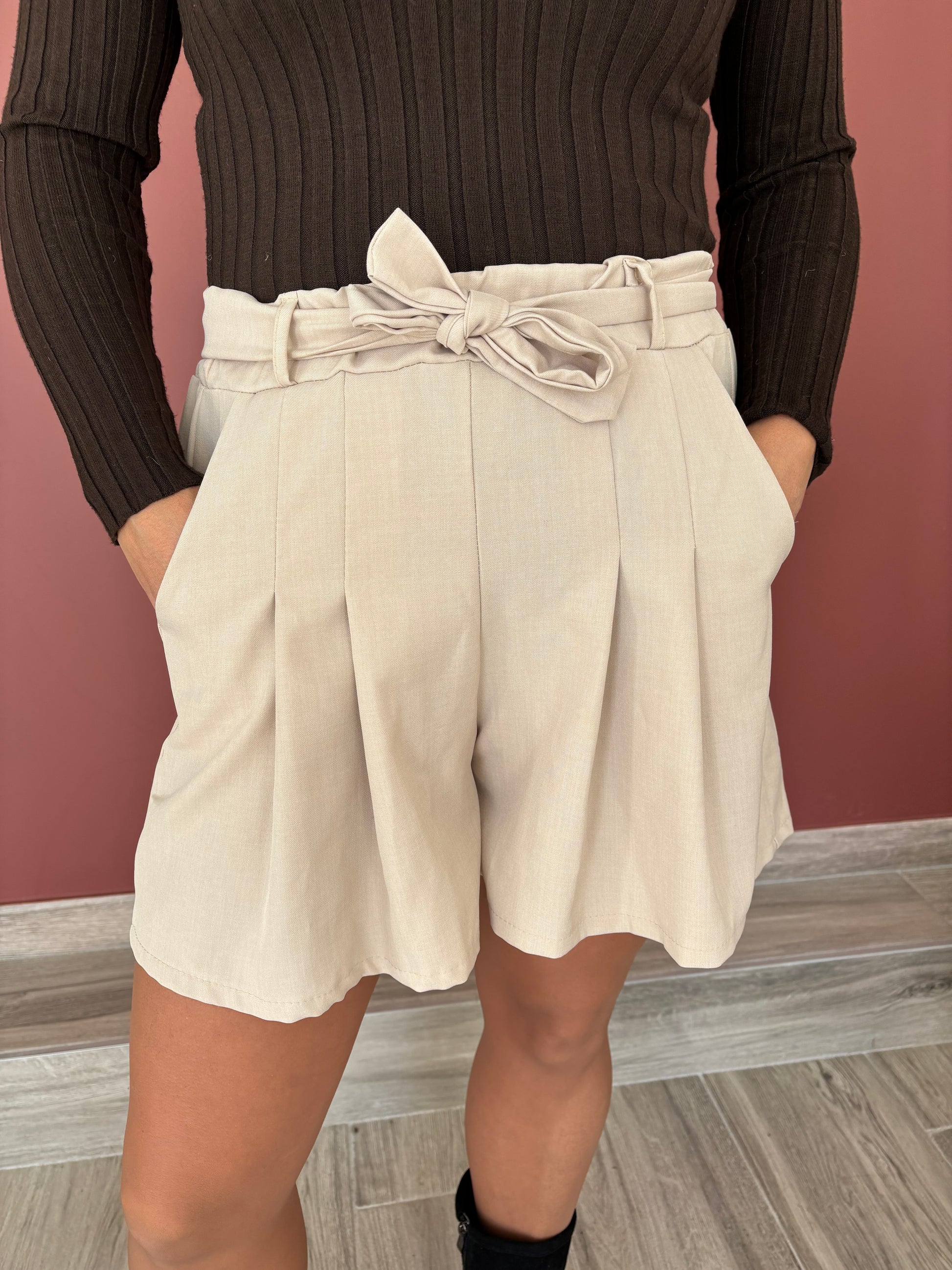 Short taille haute cordon à nouer. Taille élastique. Poches